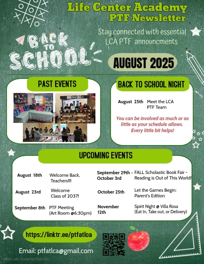 Mission: To support the mission of Life Center Academy through prayer, active parent involvement, and the sponsorship of events that promote the school, express appreciation, and raise funds to enrich the LCA community.